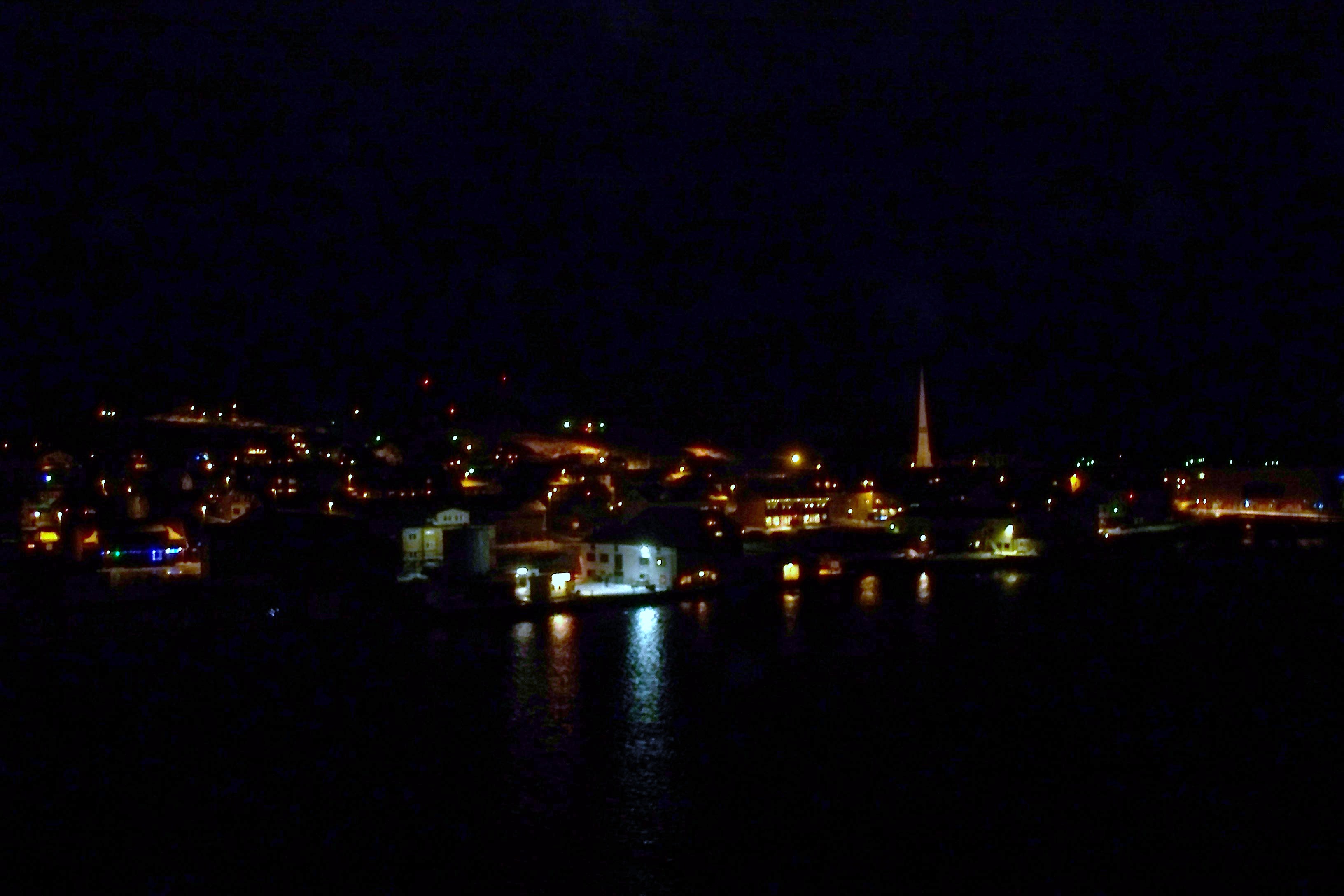 I got out to take a quick walk up and down the main street, to stretch my legs and get a feel for the place. You can see the moon up in the sky and our ship docked at the quay. In about fifteen minutes we were once again on our way.