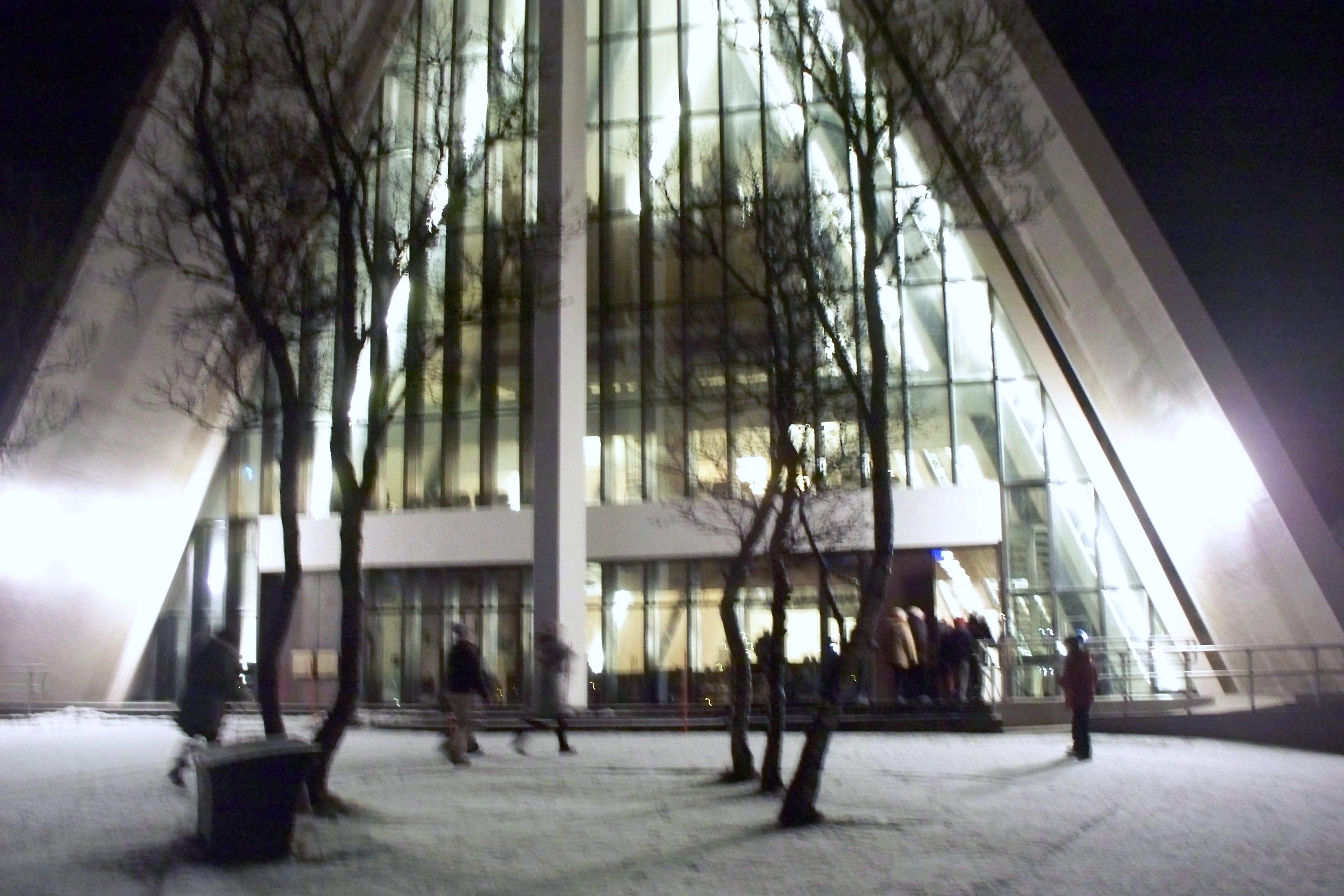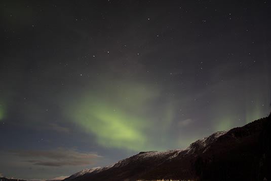 Saying Good-bye to Stokmarknes, we continue south where it looks like we are sailing straight into a mountain. Then, we enter a narrow channel where we wind our way through, with mountains on either side it seems like you can reach out and touch them. This is Raftsundet (raf-SOON-ah), a 12-mile long passage. The ful moon was out illuminating the snow on the mountains, when there they appeared again — the Northern Lights!